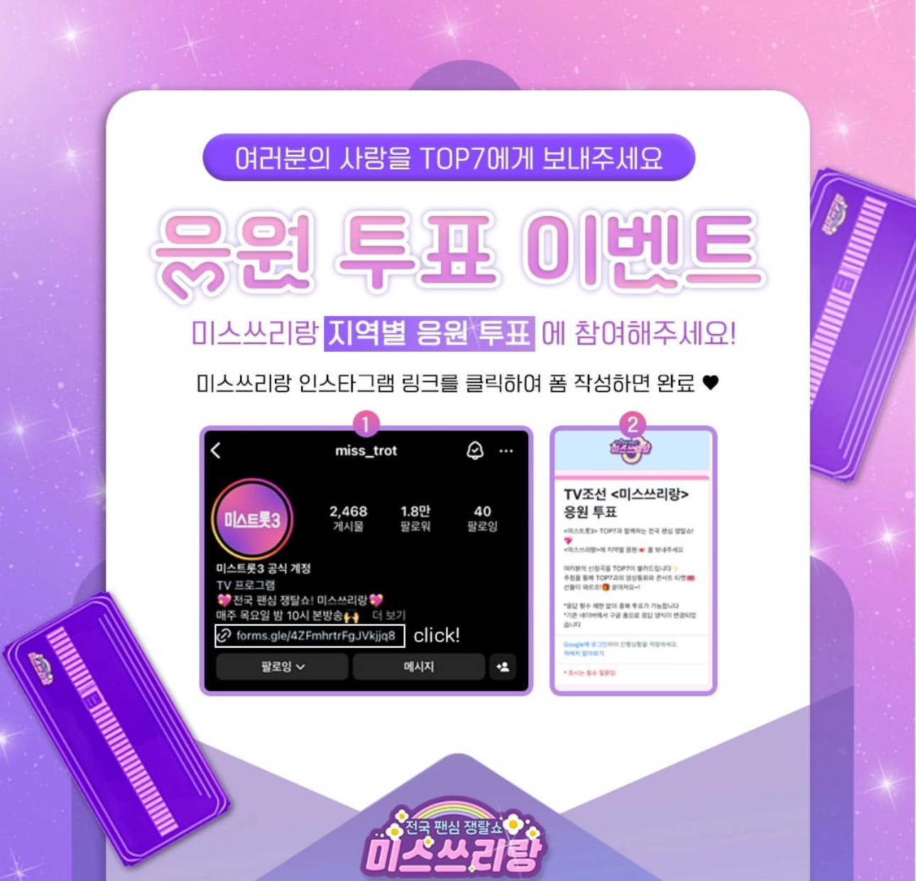 미스쓰리랑에 지역별 응원을 보내주세요. 여러분의 신청곡을 TOP7이 불러드립니다.