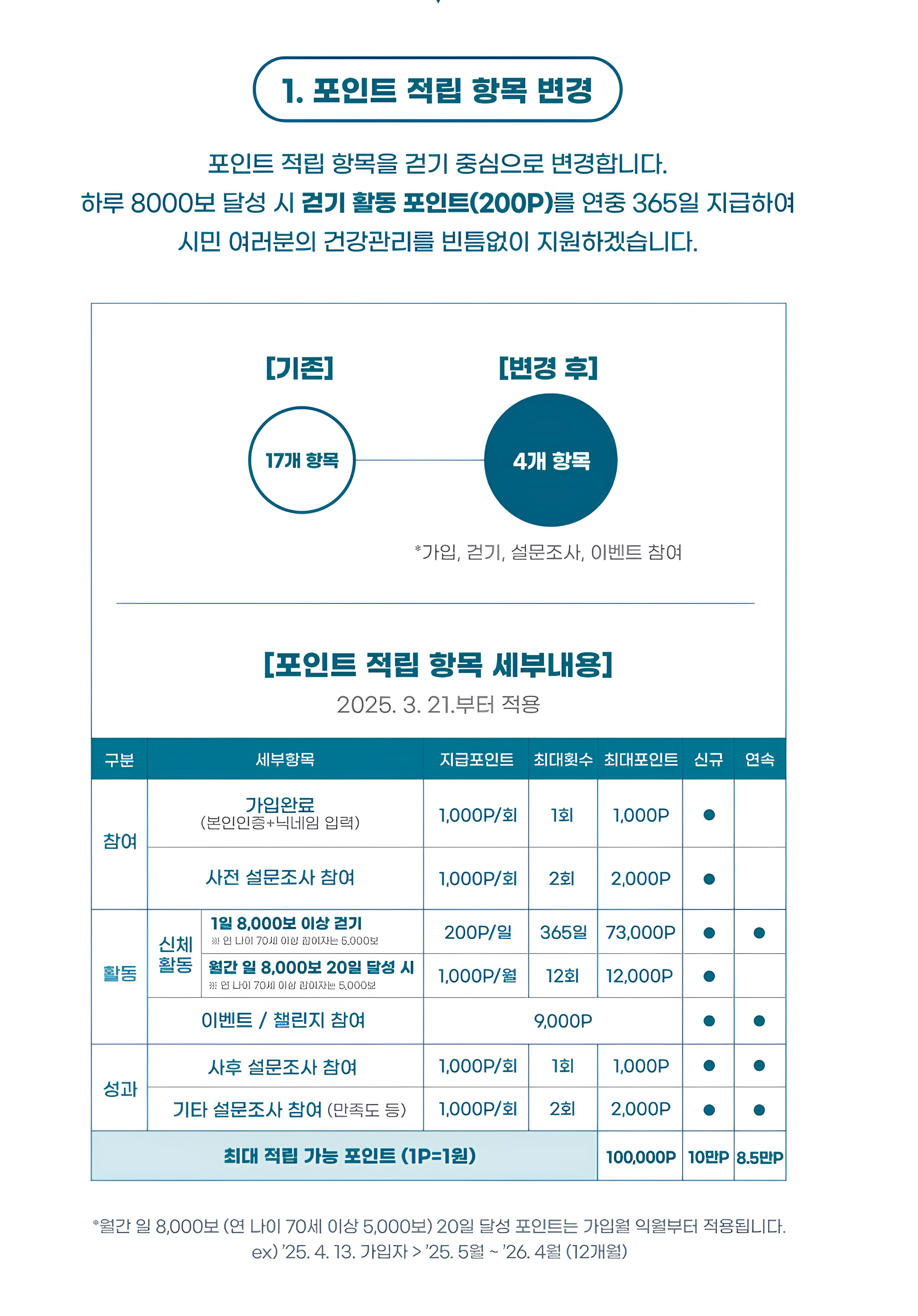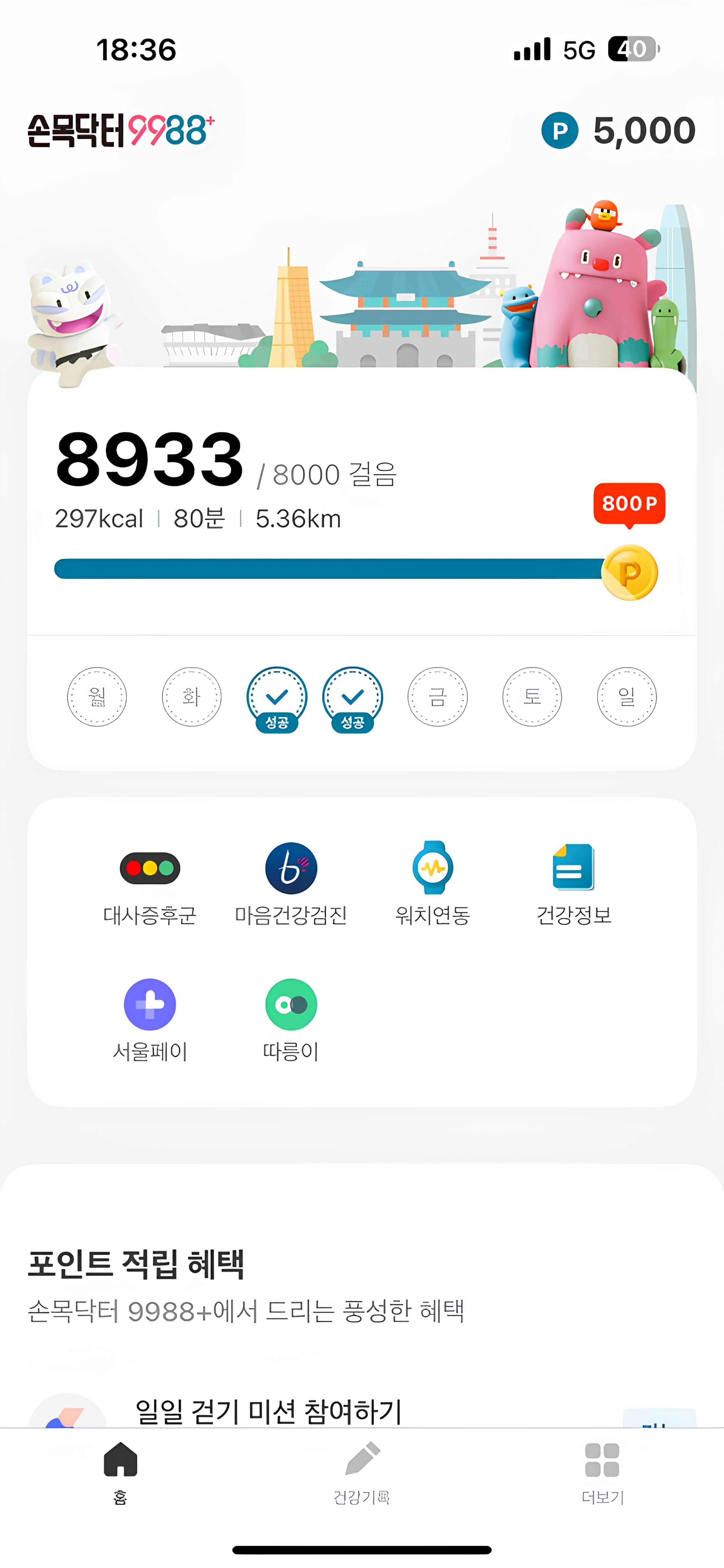 손목닥터9988은 다양한 건강미션을 제공합니다. 1일 8,000보(연나이 70세 이상 5,000보) 걷기, 건강목표 설정, 식단입력 등을 실천하면 포인트를 적립할 수 있습니다. 최대 10만 포인트까지 적립 가능하며, 이 포인트는 서울페이로 전환할 수 있습니다.