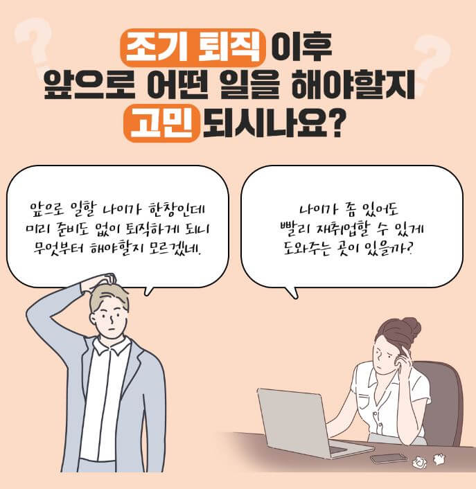 앞으로 일할 나이가 한창인데 미리 준비도 없이 퇴직하게 되니 무엇부터 해야 할지 모르겠습니다. 나이가 좀 있어도 빨리 재취업을 할 수 있게 도와주는 곳이 있을까?? 이런 고민 많이 하시죠?