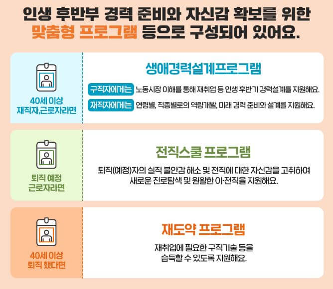 | 지원대상 | 40세이상 재직자,근로자 | 생애경력설계 |