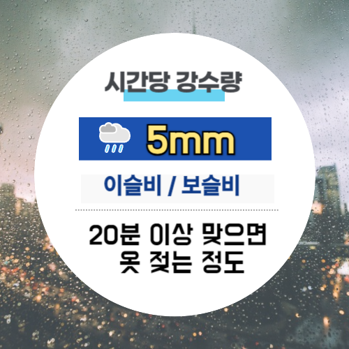✅ 5mm - 시간당 강수량 5mm는 이슬비/보슬비 수준이며 20분 맞으면 옷이 젖는 정도